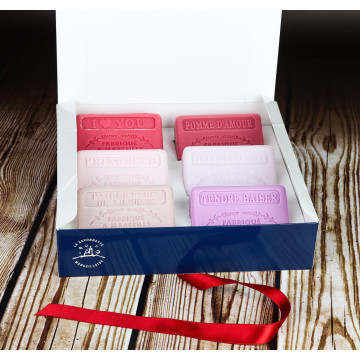 Pudełko pełne mydeł marsylskich 125g słodkich jak landrynki! W środku znajdziesz mydła: I Love You, Pomme d'Amour Księżniczka, Namiętny Pocałunek, Jednorożec, Kwiat Wiśni. Każde mydełko w zestawie jest zapakowane w folijke.